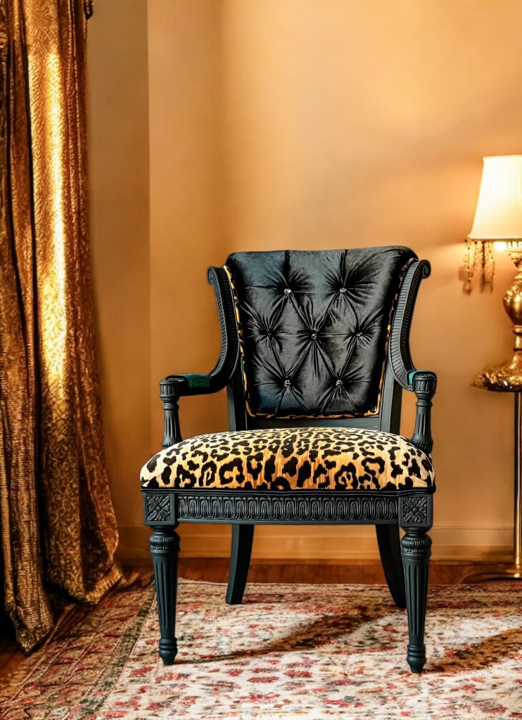 When I stumbled across this previously-loved chair on Facebook Marketplace, I saw more than a chair. I saw a story begging to be told louder. Wilder. Louder-than-leopard, lusher-than-velvet kind of loud.