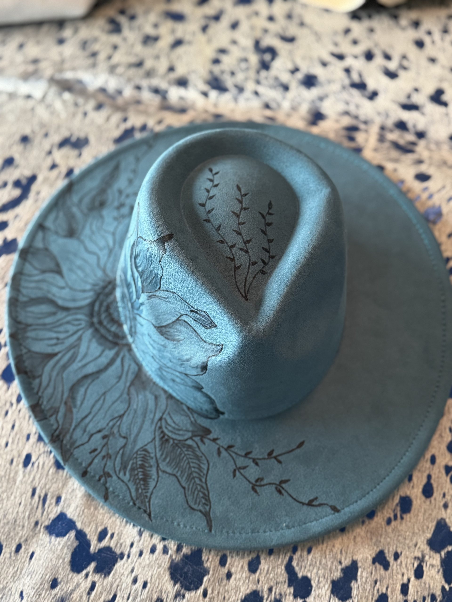Hand-Burned Peacock Blue Vegan Suede Hat – Sunflower Wide Brim Statement Hat – Adjustable Size-SOLD can recreate one for you!